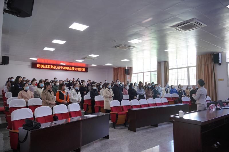 明溪縣職場禮儀專項能力職業(yè)培訓班老師授課 明溪縣委文明辦供圖