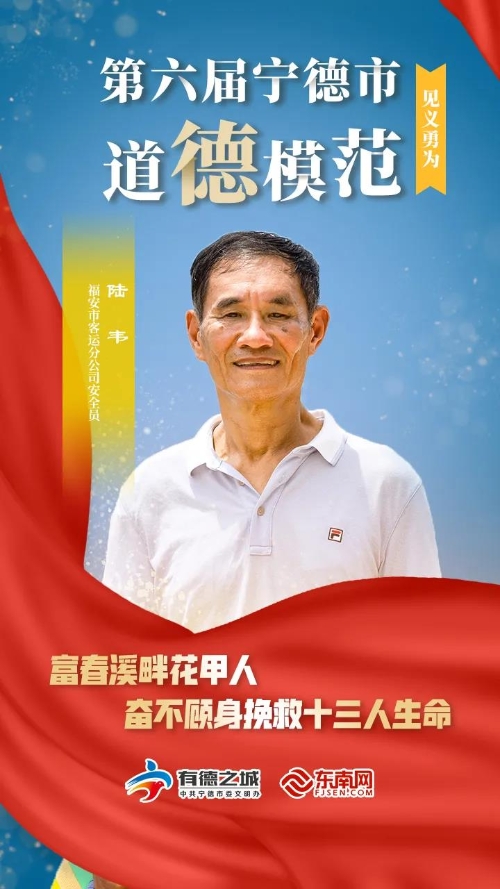 陸韋,男,1956年1月出生,寧德市汽車運輸集團有限公司福安客運分公司原職員。從10多年前第一次救起一名溺水者起,陸韋便自研水上救援泳技,自告奮勇擔當起“義務救生員”,富春溪畔參與落水救援9次、救起13人,被譽為富春溪“守護神”。他曾先后獲得寧德市見義勇為模范和寧德市、福安市兩級見義勇為先進個人二等獎。