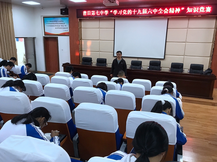 為推動十九屆六中全會精神在師生心中往深里走、往實里走,營造濃厚的學習氛圍,掀起學習全會精神新熱潮。11月30日,莆田第七中學舉辦“學習黨的十九屆六中全會精神”主題知識競賽。比賽現場氣氛活躍熱烈,隊員們沉著應戰、反應迅速,搶答聲此起彼伏,精彩的比拼贏得了現場觀眾的陣陣掌聲。該校校長吳夏暉介紹說:“通過開展知識競賽以賽促學,讓同學們了解黨的光輝歷史,感悟黨的初心使命,傳承黨的紅色基因,進一步增強民族自尊心、自信心和自豪感。”