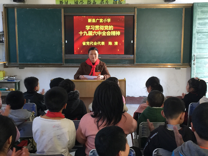 12月6日,新縣廣宮小學邀請省黨代會代表陳清為全校師生送上一場黨的十九屆六中全會精神進校園宣講活動,講述她深耕基層一線為鄉村振興、為老百姓過上幸福生活的動人故事。同時從深刻認識黨的百年奮斗的初心使命和重大成就等方面,對黨的十九屆六中全會精神進行了解讀,宣講內容生動深刻、激勵震撼,增強了學生們的民族自豪感與自信心。學生們紛紛表示,作為新時代的少先隊員,我們要聽黨話、感黨恩、跟黨走,做有志向、有夢想的社會主義接班人。