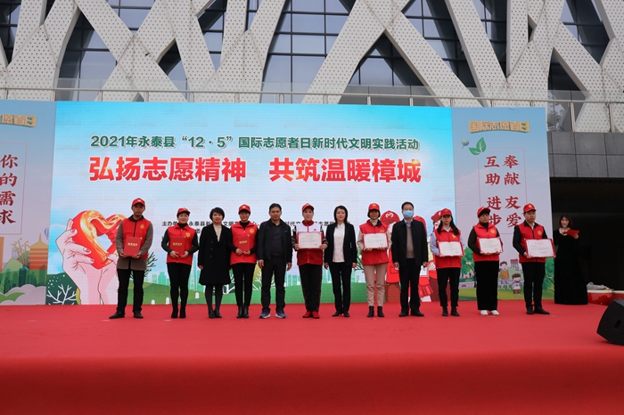 活動中,縣委宣傳部副部長、文明辦主任張麗霞宣讀永泰縣獲得2020年和2021年福州市志愿服務先進典型名單以及2021年永泰縣一至三星級志愿者名單,并激勵他們要繼續傳播志愿服務理念,努力營造新時代文明實踐活動的濃厚氛圍。縣領導與主辦單位領導為先進典型和星級志愿者代表頒發證書。