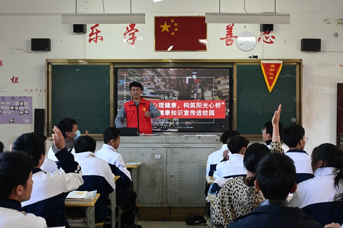 心理健康知識講座現(xiàn)場,志愿者通過現(xiàn)場提問,引導學生們學會傾聽和表達。攝影:朱丹