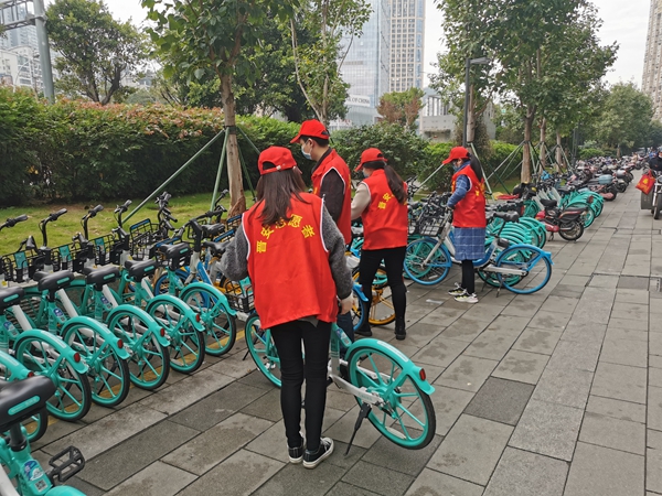 志愿者整理亂停放的共享單車。晉安區(qū)委文明辦供圖