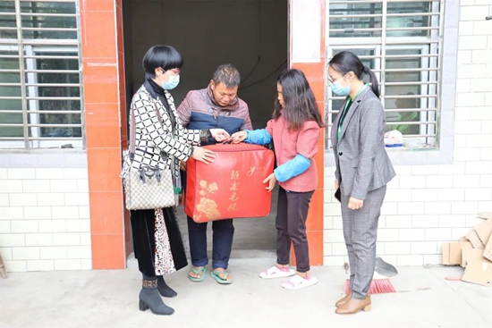 工作人員探望困境兒童,送上愛心棉被。