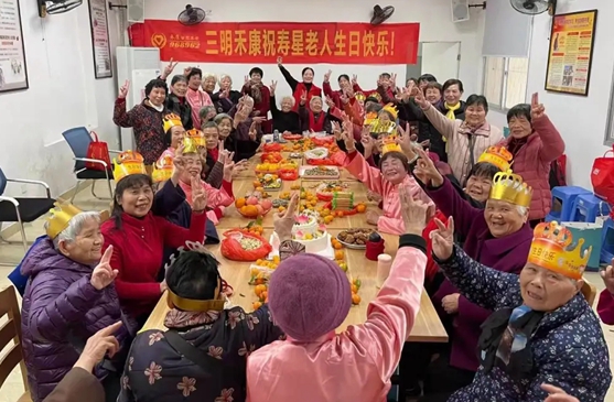 活動現場,社區工作人員、禾康志愿者為21位壽星準備了水果、生日蛋糕,老人們圍坐一桌,頭戴生日帽,在場的志愿者們和壽星們一起吹蠟燭,切生日蛋糕、齊唱生日歌,并為老人們送上了誠摯的生日祝福,活動現場歡聲笑語,溫馨、歡樂。