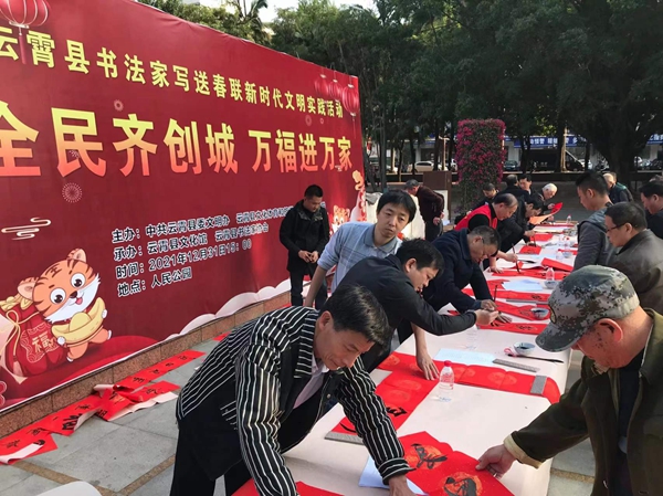 文明風12月31日訊 2022年春節將至,“過新年,貼春聯”是中華民族傳統習俗,它象征著吉祥,也表達著人們對美好生活的向往。為了營造良好的節日氛圍,讓全縣人民度過一個歡樂祥和、文明健康的新春佳節。2021年12月31日下午,由云霄縣委文明辦、文體旅局、文聯主辦,縣文化館、書法家協會承辦的“全民齊創城·萬福進萬家”書法家寫送春聯新時代文明實踐活動在人民公園舉辦。此次活動組織書法家志愿者40余人,現場書寫春聯和“福”字分發給群眾。