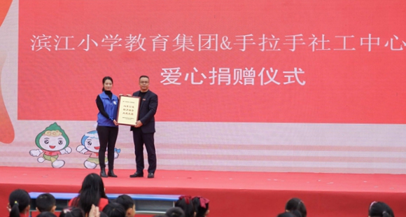 此外,當天還舉行了捐贈儀式。此前,濱江小學教育集團積極開展了“垃圾再生作品”義賣活動,共籌集愛心義款三萬元。儀式上,濱江小學教育集團總校長李斌將所得善款全數捐贈于福清市手拉手社會工作服務中心。