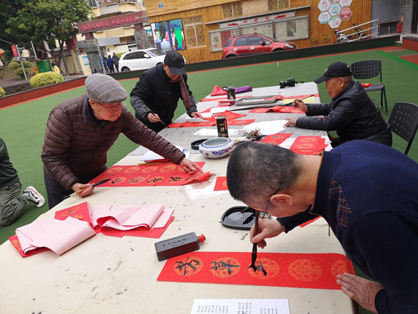 近年關,為倡導群眾“喜事緩辦,喪事簡辦,宴會不辦”,推動移風易俗,減少人員聚集帶來的疫情傳播風險,在鼓樓各街道、社區新時代文明實踐所和站,志愿者們在認真學習熟知最新的疫情防控通告要求和有關移風易俗文明宣傳內容后,通過LED顯示屏、入戶走訪等“線下”宣傳及QQ群、微信群“線上”宣傳等方式,做到群眾有問必答,確保人人知曉最新疫情防控通告。同時白龍社區聯合福州市梅峰軍休所開展“迎新春、送春聯、送祝福”活動,來自梅峰軍休所的志愿者們不畏寒冬,為轄區居民用心書寫春聯,活動現場還組織開展移風易俗宣傳活動,通過發放宣傳單,書寫移風易俗相關春聯等,一幅幅春聯滿載墨香,寫出了政通人和的新年景,書出了安定祥和的幸福年。