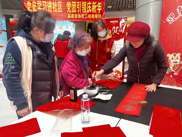 福州大學老年書畫藝術協會書法家現場潑墨撰寫春聯(鼓樓區委文明辦供圖)