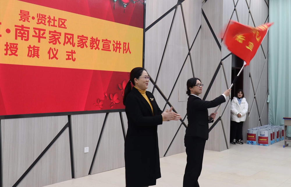 楊鑾向社區巾幗志愿者代表授予“八閩巾幗紅·南平家風家教宣講隊”旗幟 范耀楚/攝