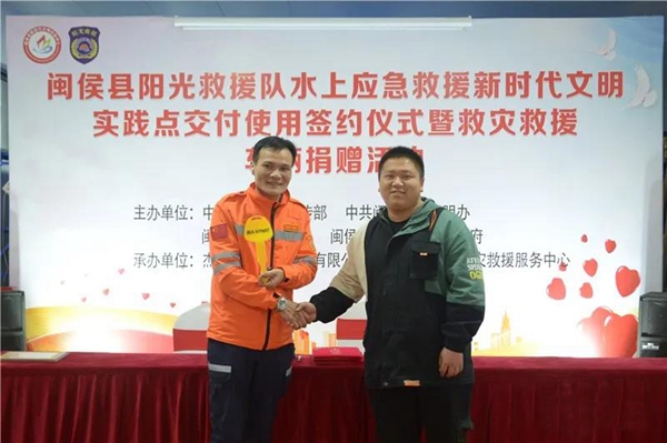 文明風1月18日訊 1月16日,由閩侯縣委宣傳部,縣委文明辦,縣應急管理局,閩侯縣祥謙鎮黨委、政府主辦,杰塏(福州)建設有限公司、福建省陽光救災救援服務中心承辦的陽光救援隊水上應急救援新時代文明實踐點交付使用簽約儀式暨救災救援車輛捐贈活動在祥謙鎮枕峰村開展。