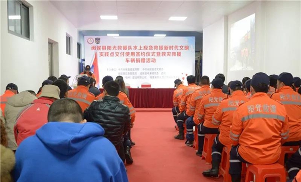 隨后,由縣委文明辦相關負責人為水上應急救援(陽光)志愿服務隊授旗,杰塏(福州)建設有限公司總經理作為代表將捐贈救援車進行交接。