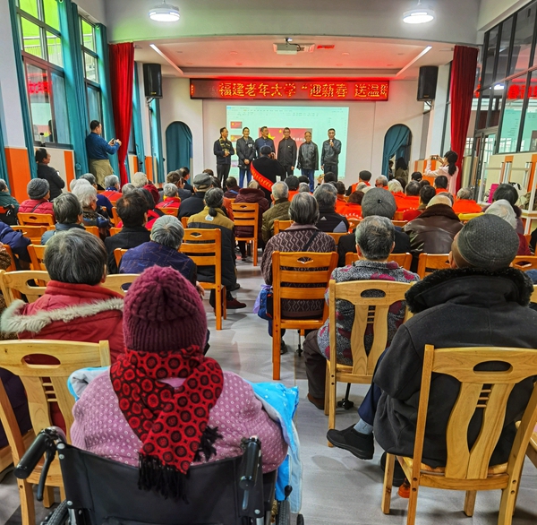 文明風1月19日訊 歲末情深,暖意融融。在2022年新春佳節即將到來之際,福建老年大學志愿者來到福州市西園老年公寓(長青養老院),開展“迎新春、送溫暖、獻愛心”慰問演出和送春聯活動,為老人們送去新春的祝福。