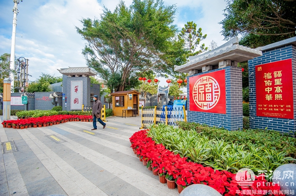 在翠園,公園門口已經擺上了不少鮮艷的盆栽,一側的宣傳欄上粘貼著“福”字以及“福星高照”“福佑中華”等福文化的喜慶標識,在盆栽的襯托下十分喜慶。
