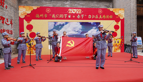 在主場舞臺上,器樂合奏《茉莉花》拉開了濃郁的“福”文化表演序幕。情景式演唱《疍家新歌》以孩童的視角講述了臺江區(qū)疍家漁民脫貧上岸的故事,展示臺江非遺文化;歌曲演唱《我的古厝老家》、《天下福地最美福州》等唱響了有福之州的千年文化和文明之美;伬唱《逛新城》用濃濃的“蝦油味”展示福州伬藝的魅力;書樂《五福鬧春》伴著和美的樂聲現(xiàn)場書寫展示五種不同“福”字的寓意,寄托對國泰民安的美好祝愿。小提琴演奏《在燦爛的陽光下》抒發(fā)了少年們童心向黨、爭做新時代好少年的時代心聲。小號獨奏《奮進》、歌舞表演《領(lǐng)航新時代》在激昂的旋律中將活動推向了高潮。