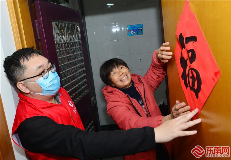 臺青志愿者和居民共同貼福字。(主辦方供圖)
