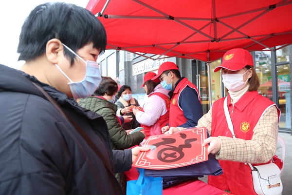 區委文明辦組織志愿者開展移風易俗宣傳,派發福聯、核心價值觀購物袋等 倉山區融媒體中心供圖