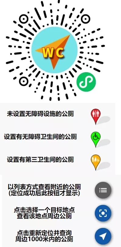 進入之后,頁面會自動搜索周邊的公共廁所,并將分布情況在地圖上呈現出來,不同的圖標代表公廁的設施配置情況。同時,點擊對應的廁所圖標,通過手機的GPS功能,可以導航到距離最近的公共廁所。目前中心城區111座環衛、園林管護公廁均被納入其中,利用“互聯網+”實現公廁精準定位。