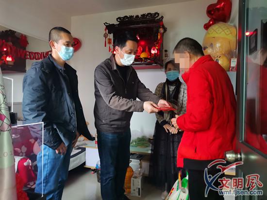 街道機關第四黨支部把慰問金送到湖邊社區困難居民家中(金山街道供圖)