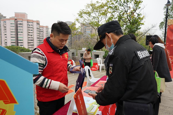 中共倉山區委文明辦志愿者向來往市民發放《福建省志愿服務條例》宣傳折頁、移風易俗宣傳手冊、新時代文明實踐購物袋等宣傳品 共青團倉山區委員會供圖