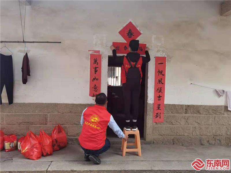 1月16日至25日,集美區盧媽媽愛心隊開展為期十天的春節送暖志愿服務活動。圖為志愿者為居家五保戶老人貼春聯(盧媽媽愛心隊供圖)
