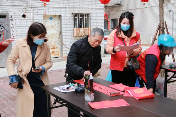 活動現場,書法愛好者現場為居民免費寫春聯。“福照家門萬事興,喜居寶地千年旺”“吉祥如意人增壽,道德清心福滿門”……揮毫潑墨間,一副副飽含祝福和喜慶的春聯無不寄托著大家對新年美好生活的祝福和期待。