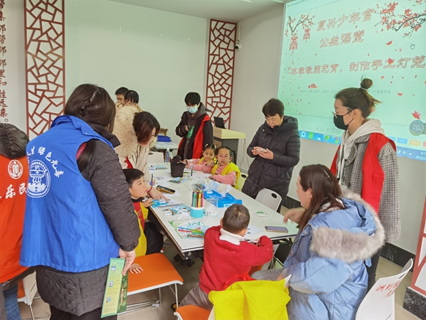 志愿者與小朋友一起制作手工燈籠(長樂區工信局供圖)