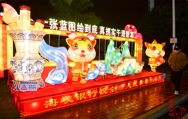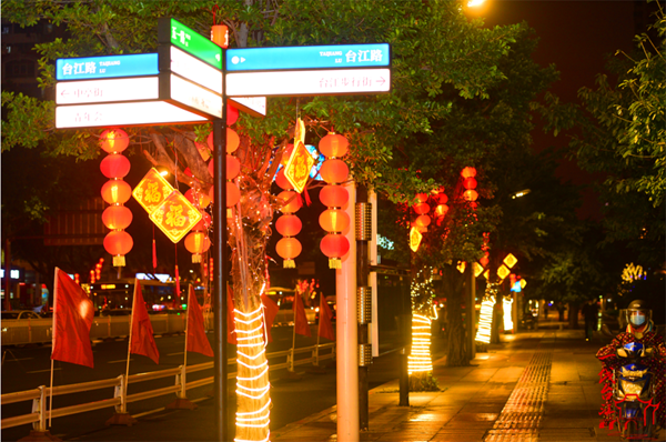 文明風2月15日訊 今年,臺江區元宵燈會延續上一年做法,不集中舉辦大型燈展,在轄區五一路、江濱大道、六一路、八一七路、臺江路、長樂南路、白馬路、荷塘路等8條重要道路分散設置燈組。此次燈會展出“一張藍圖繪到底 真抓實干譜新篇”“濱江福地 活力商都”“時光杭行閩商福地”“山水福運 魅力江濱”等若干主題燈組。同時,運用滿天星燈串、福字燈籠、中國結等亮化街景,加強節日氛圍布置,為市民群眾送上新年祝福。