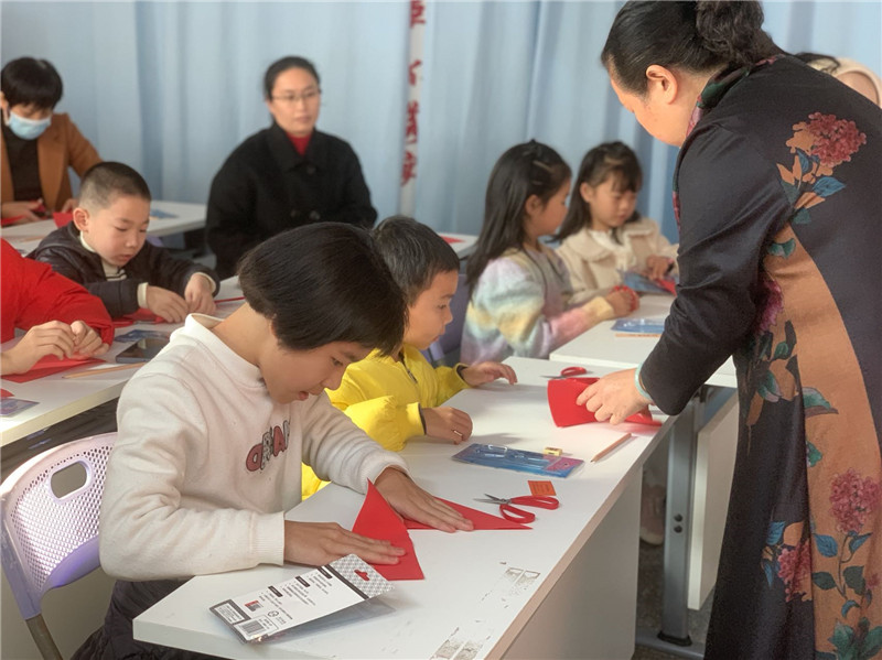 福海社區剪紙活動現場,老師耐心講解指導孩子們(溫麗卿供圖)