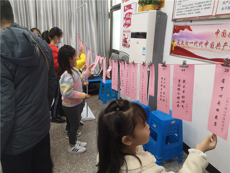 剪紙活動后,志愿者們迅速對現場進行調整布置,懸掛著謎語的紅色紙條喜氣洋洋很快就吸引了在旁休息的親子家庭,謎面有大家喜聞樂見的字謎、人名謎、成語謎,也有黨史等新的謎面。猜燈謎活動正式開始后,家長孩子們爭先恐后看謎面,猜謎底,有的在熱烈的討論,有的在細心的引導,有的在默默地沉思,樂中有學,領略到了漢語言的無窮奧妙,隨著一條條謎底被猜中,大家手拿紅燈籠小禮品,喜笑顏開。