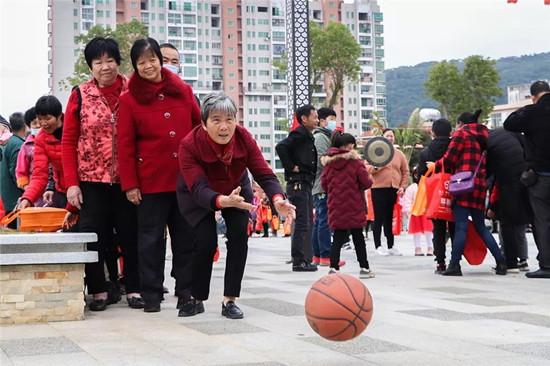 一旁的“游園聚福”游戲區則是最受孩子們歡迎的區域。釣魚、套圈、投籃、飛鏢、盲人敲鑼、保齡球,豐富的游戲將現場活動推向高潮,老人小孩圍成圈,歡聲笑語不斷。