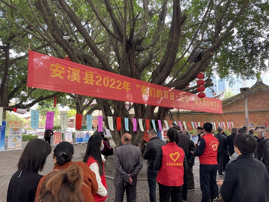 文明風(fēng)2月17日訊 為培育和踐行社會(huì)主義核心價(jià)值觀,深化新時(shí)代文明實(shí)踐,傳承中華優(yōu)秀傳統(tǒng)文化,引領(lǐng)群眾關(guān)注福文化、參與福文化、發(fā)展福文化,營(yíng)造向上向善的社會(huì)風(fēng)尚, 2月15日,安溪縣文明委以“我們的節(jié)日·元宵”主題活動(dòng)為契機(jī),在鳳城鎮(zhèn)龍津公園組織開展2022年元宵節(jié)推廣“?!蔽幕鐣?huì)宣傳主題活動(dòng)。