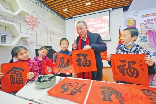 在溫泉街道瓊河社區(qū)新時(shí)代文明實(shí)踐站,書(shū)畫(huà)家黃聲如現(xiàn)場(chǎng)創(chuàng)作“福”文化作品。 池遠(yuǎn)攝