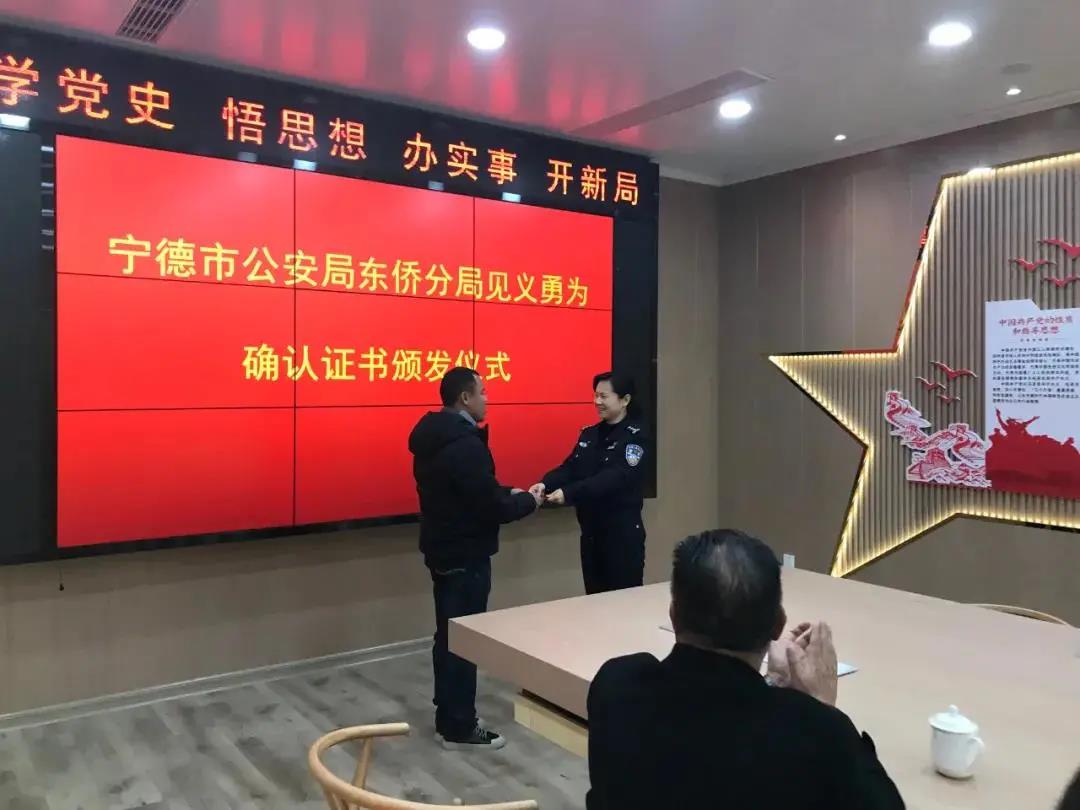 2月16日,寧德市公安局東僑分局見義勇為人員確認證書頒發儀式在大門山派出所環東湖巡防隊值勤點舉行。東僑分局黨委委員、見義勇為工作辦公室主任鐘劍為李玉保頒發見義勇為確認證書。