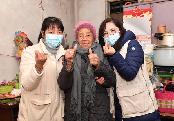 老人高興地和鼓樓社區工作人員合影。(鼓樓區委文明辦供圖 毛朝青攝)