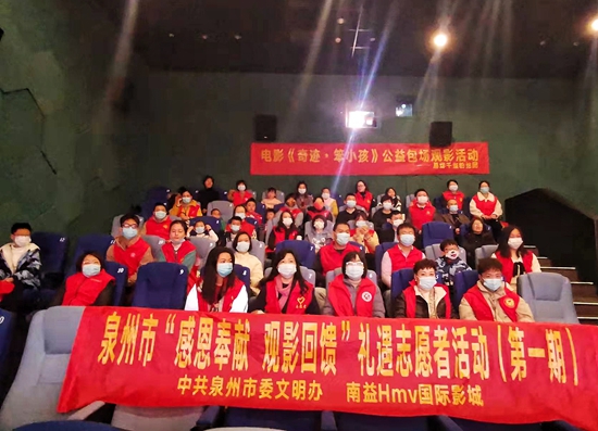 文明風(fēng)2月24日訊 為貫徹落實《福建省志愿服務(wù)條例》,激勵、禮遇志愿者,在第59個學(xué)雷鋒紀(jì)念日到來之際,泉州市開展禮遇志愿者系列活動。2月19日早上,“感恩奉獻(xiàn) 觀影回饋”禮遇志愿者活動在豐澤區(qū)南益Hmv國際影城舉行。70多名志愿者和志愿者親屬走進(jìn)電影院,觀看電影《奇跡·笨小孩》。