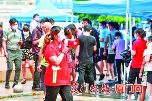 去年9月,同安突發(fā)新冠肺炎疫情。9月13日上午,作為協(xié)會(huì)秘書長(zhǎng)的李玉花和協(xié)會(huì)的23名志愿者奔赴新民街道烏涂社區(qū)壩仔埔里,隨后轉(zhuǎn)戰(zhàn)新民中心小學(xué)核酸檢測(cè)點(diǎn)。看到現(xiàn)場(chǎng)有些群眾情緒緊張焦慮,她舉起小喇叭喊話:“有沒有人能幫忙一起維持秩序?”她的呼吁很快得到響應(yīng),熱心群眾和志愿者組成“人墻”,核酸檢測(cè)點(diǎn)現(xiàn)場(chǎng)井然有序。