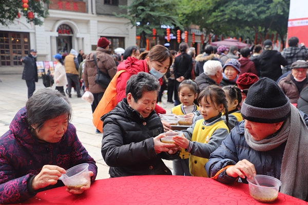 2月27日,福州市委文明辦、臺江區(qū)委宣傳部、臺江區(qū)社會科學(xué)界聯(lián)合會、茶亭街道、閩都鄉(xiāng)學(xué)講習(xí)中心及南仙茉莉聯(lián)合舉辦“過拗九節(jié)吃福粥,唱福歌”主題活動,基層理論宣講員將民俗故事與紅色理論有機結(jié)合為居民講述福州拗九節(jié)的故事和習(xí)俗、唱福歌送祝福、送福粥獻(xiàn)愛心等拗九民俗活動。五歲稚童用一顆感恩的心給在場長輩送粥送福,傳統(tǒng)孝順文化在小小茶攤得到了傳承和發(fā)揚。