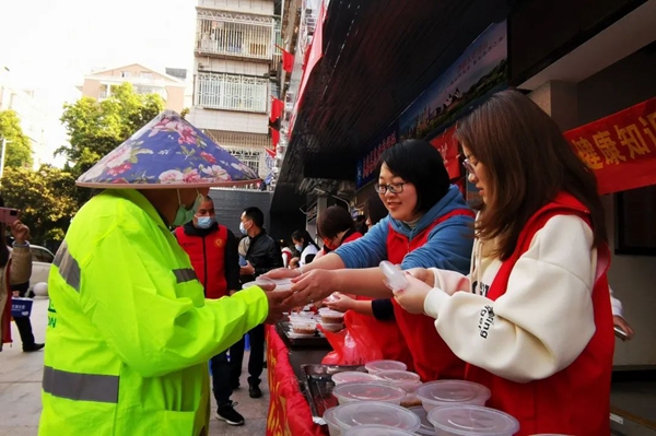 志愿者為環(huán)衛(wèi)工人送上拗九粥(永泰縣委文明辦供圖)