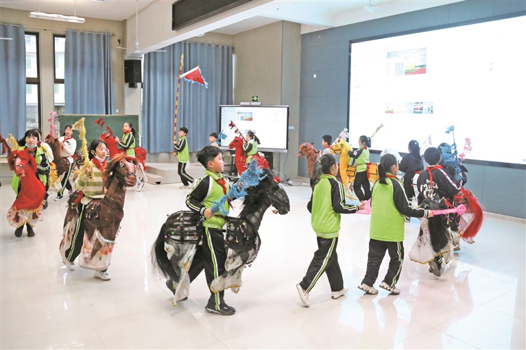 “我從三年級開始學,一般飾演‘士兵’角色,感覺既新奇又光榮,也特別希望能通過我們的表演,將前岐馬燈這個非物質文化遺產傳承、發揚光大。”騎上“戰馬”,五年級學生游治謹滿臉自豪。