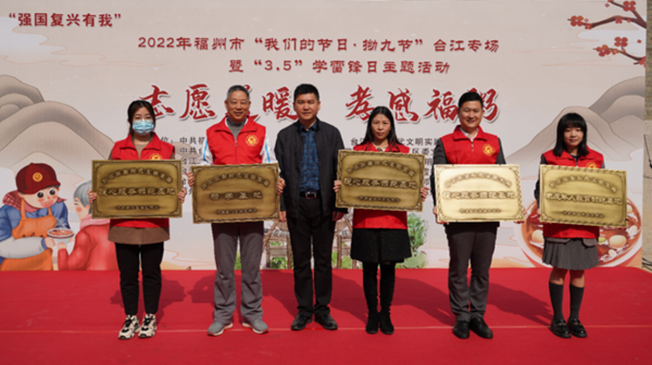 結合雷鋒月活動,臺江區領導為第二批新時代文明實踐基地代表、第三批新時代文明實踐志愿服務驛站代表授牌,為志愿者代表頒發“鄰里互助 時間銀行”黨群志愿服務存折。