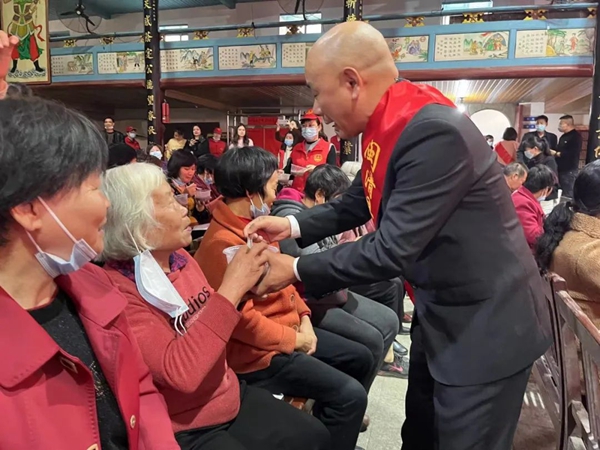 閩清縣道德模范代表把拗九粥送到老人手中。