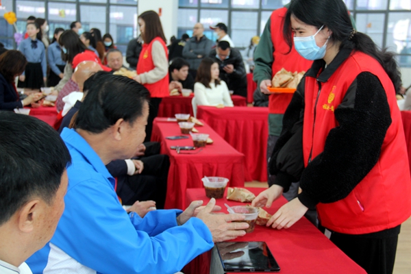 志愿者為來賓送上拗九粥等民俗小吃。 陳燕平攝