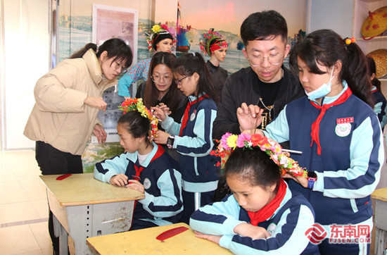分發、束發、盤頭、插花、定型……在臨海小學的“蟳女服飾展示館”里,十幾名孩子在老師的帶領下,能在二十分鐘內盤完一個蟳埔女傳統頭飾“簪花圍”。蟳女頭飾是當地的民俗特色,被喻為女子頭上“流動的花園”。復雜的頭飾制作并沒有讓孩子們失去興趣,反而更認真地進行學習。