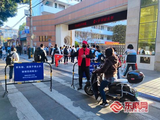泉州七中金山校區門口,家長志愿者維持交通秩序。學校供圖