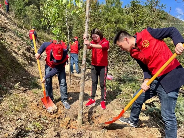在活動分會場金沙鎮廣峰村,植樹活動也如火如荼地開展著,來自共青團閩清縣委員會、閩清移動公司團委等單位的志愿者們手拿手持鋤頭、鐵鍬等工具,大家兩三人一組,相互協作,挖坑、填土、澆水,精心栽下一株株樹苗,整個活動現場繁忙而有序。據統計,活動共種植梅花、香樟等樹苗100余棵。