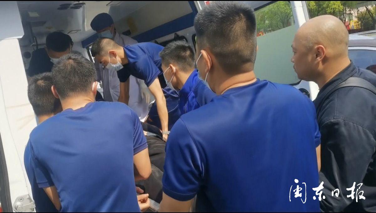 消防救援人員將老人抬上救護車。閩東日報 供圖