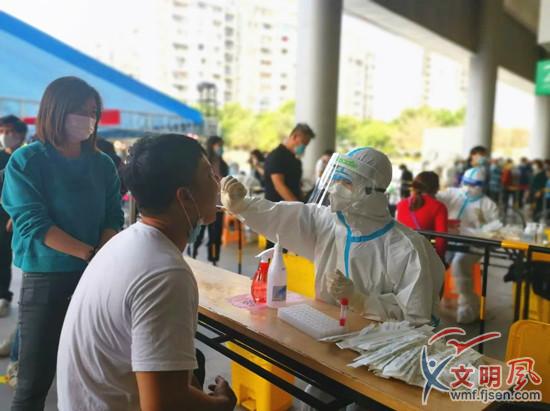 醫護人員耐心地引導居民進行核酸采樣(翔安區委文明辦供圖)