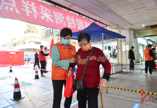 3月20日,在中亭街核酸檢測采樣點,陳美珠(左一)在給行動不便的居民排憂解難(葉誠 攝)