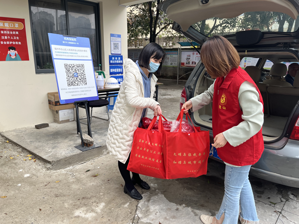 倉山區委文明辦工作人員將志愿紅馬甲等物資送抵金山街道。倉山區委文明辦供圖